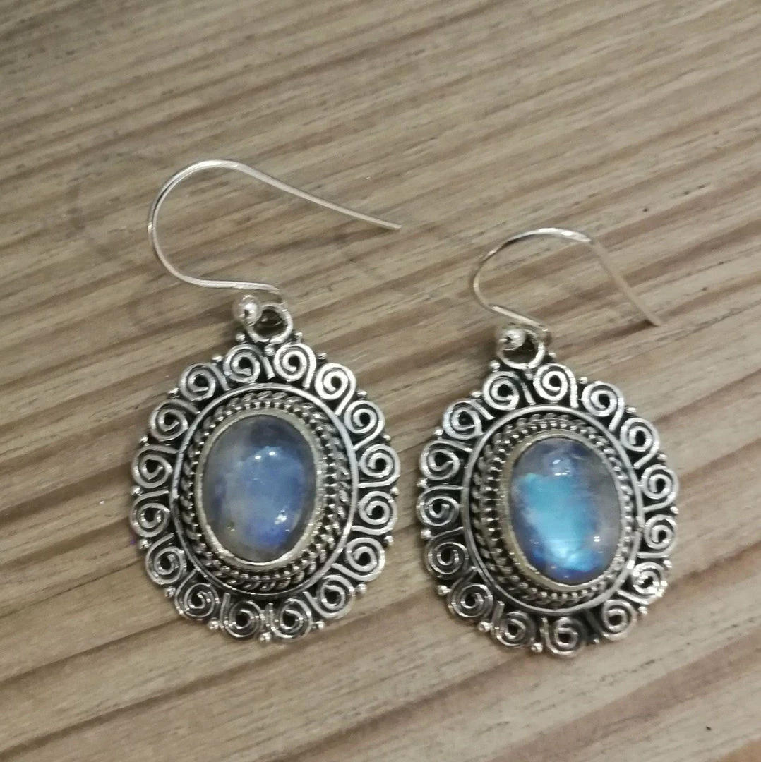 This is a stunning pair of Rainbow Moonstone earrings. Quality stones with beautiful Schiller in very pretty decorative sterling silver settings. Stamped .925.