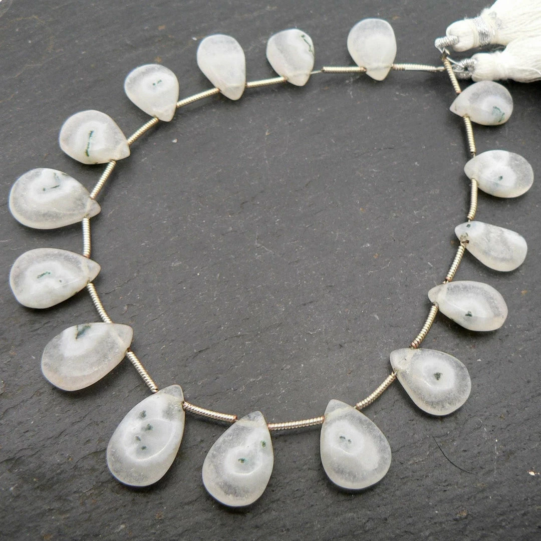 Extremely beautiful, unusual and eye catching solar quartz plain pear briolettes with a very glossy finish. Beads are graduated on the strand from 11x13mm to 11x15mm. 16 beads to the strand.