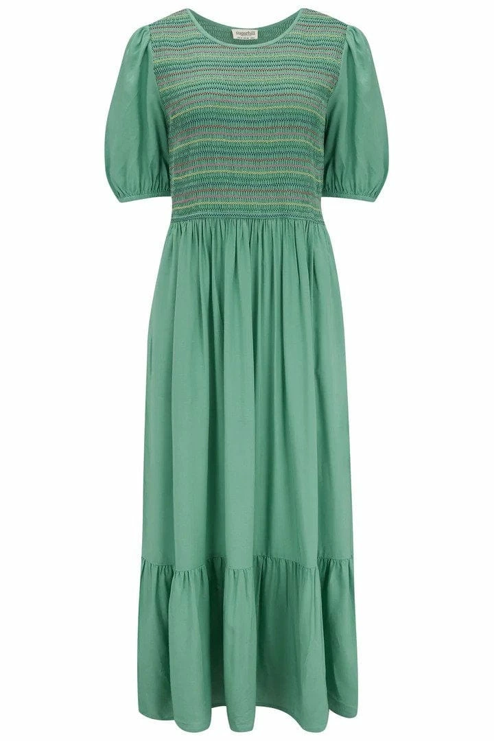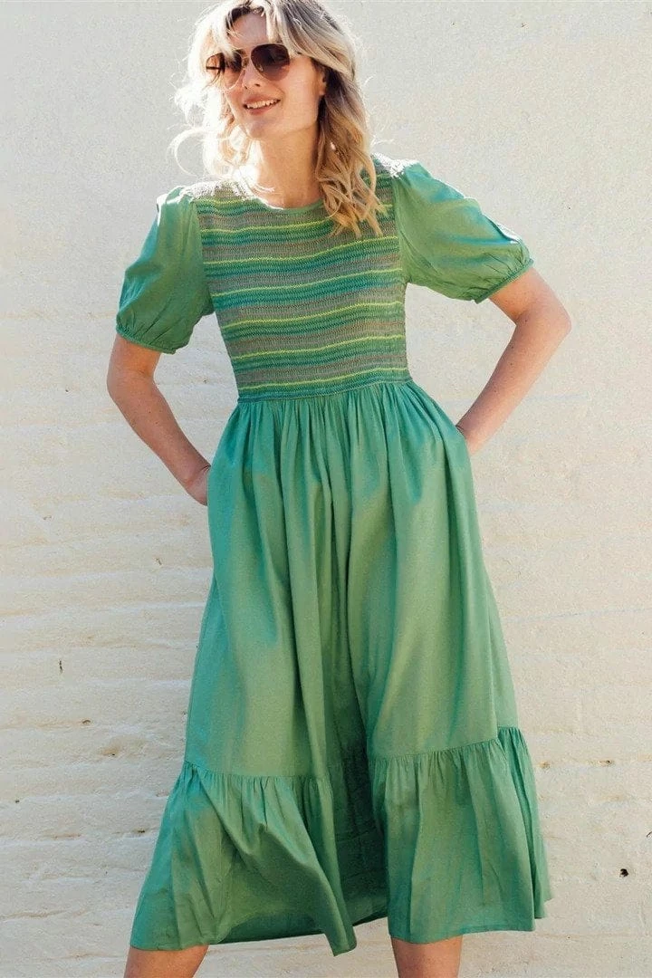 Our new Alize style has a vintage, Seventies feel. This style has an elasticated, embroidered shirred bust,Β half length puff sleeves and a full midi skirt with a frill hem. TheΒ Alize Midi Shirred Dress has bands of rainbow stitching across the bust, matched with a muted green base.