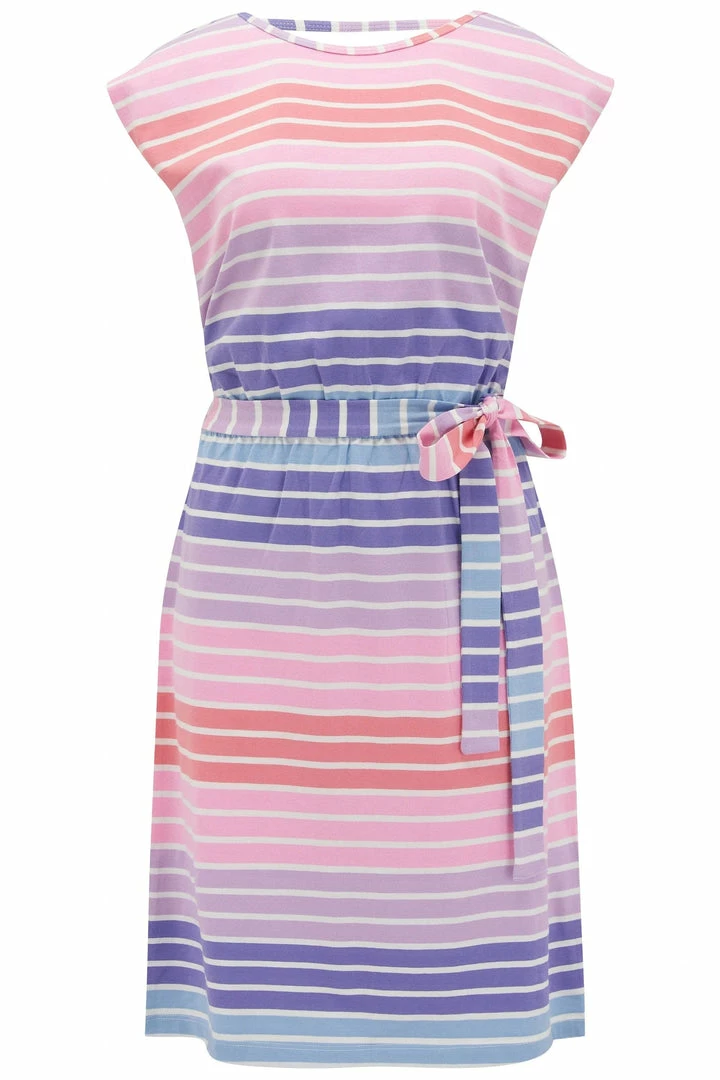 This summer-ready printed dress is crafted from breathable organic cotton with a cutaway back detail, an elasticated waist for added comfort and a matching tie waist belt. This design has blue base with ombre stripes.