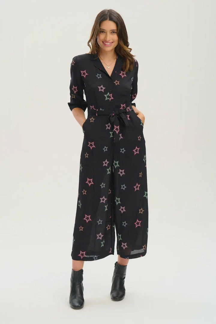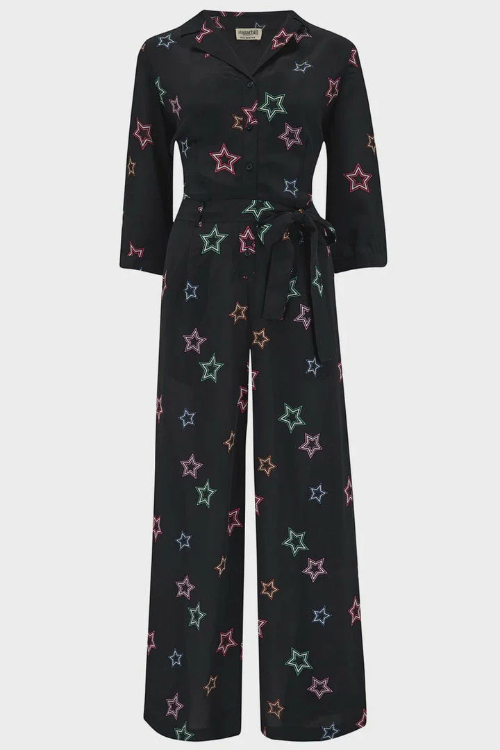 A new shape for Autumn ’22, the Rylee has a fitted revere collar upper, half length sleeves, a nipped in waist with a tie belt and wide leg cropped trousers. The Ryleeย showcases our Rainbow Stars print fabric, with scattered star outlines in green, red and pink on a black base.ย
