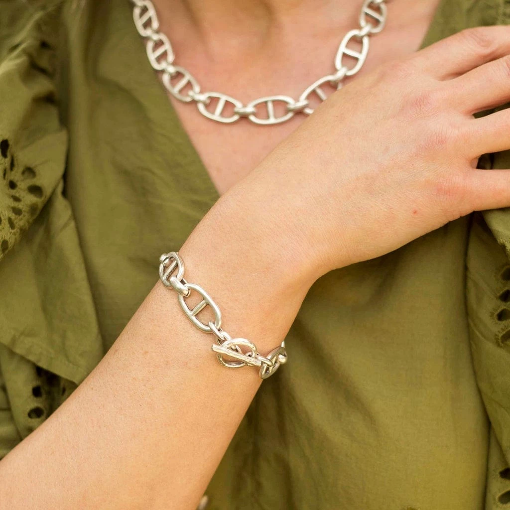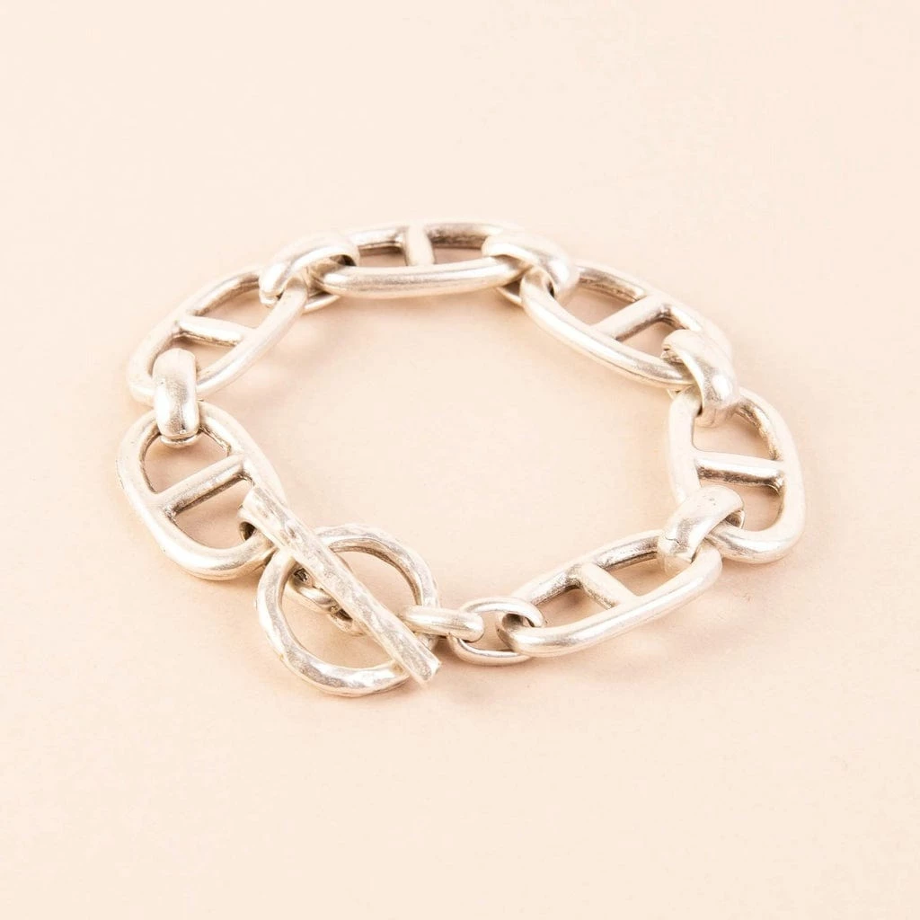 A middle-bar chain bracelet with a T-bar toggle clasp adds a quick punch to any outfit!