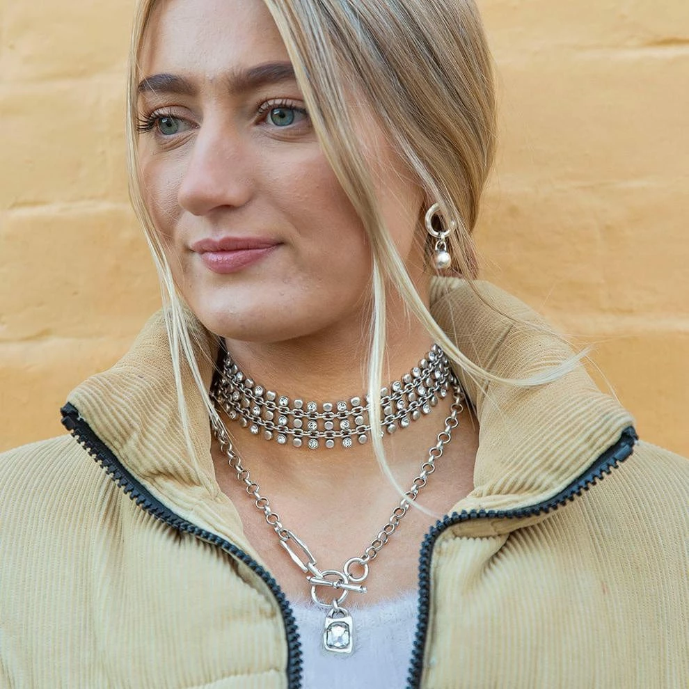 Treaty’s gorgeous Scarlet Crystal Choker is sure to turn some heads this season. A fitted choker with 4 rows of facet cut clear crystals and silver dots – the band is 2.5cm wide and sits comfortably around any neck due to the adjustable chain extender.