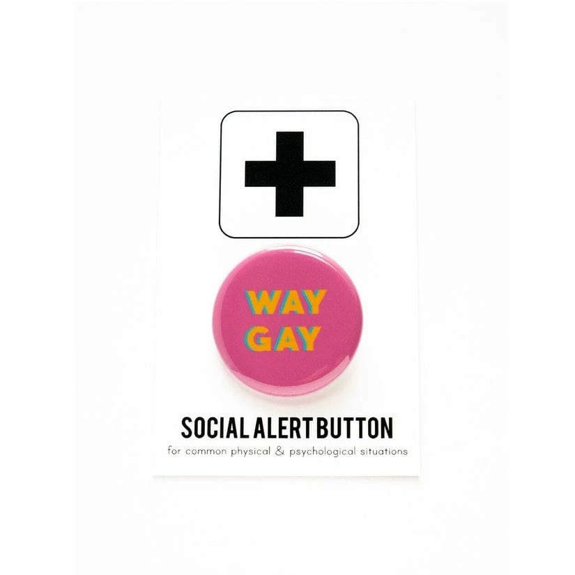 WAY GAY – SOCIAL ALERT BUTTON • 1.25″ pinback buttons • Hand-pressed in Los Angeles, CA • Affixed to a sturdy Social Alert backing card • Sealed in a clear cello sleeve with hang tab • Color may vary slightly by device viewed on • Word for Word are a queer-owned & operated brand
